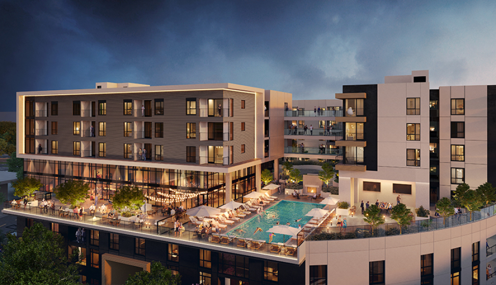 The five-story building exterior was designed with Irvin Gil’s influences, considered a pioneer of the modern movement in architecture and commonly found in southern California. The exterior design features white stucco walls contrasted by a brick cladded base and colorful tile insets. The building massing is softened with deep roof overhangs and gracefully articulated arched openings at the ground level. Rounding the street-facing building elevation is a focal entry courtyard and a landscaped rooftop terrace on the fifth level overlooking the existing streetscape.